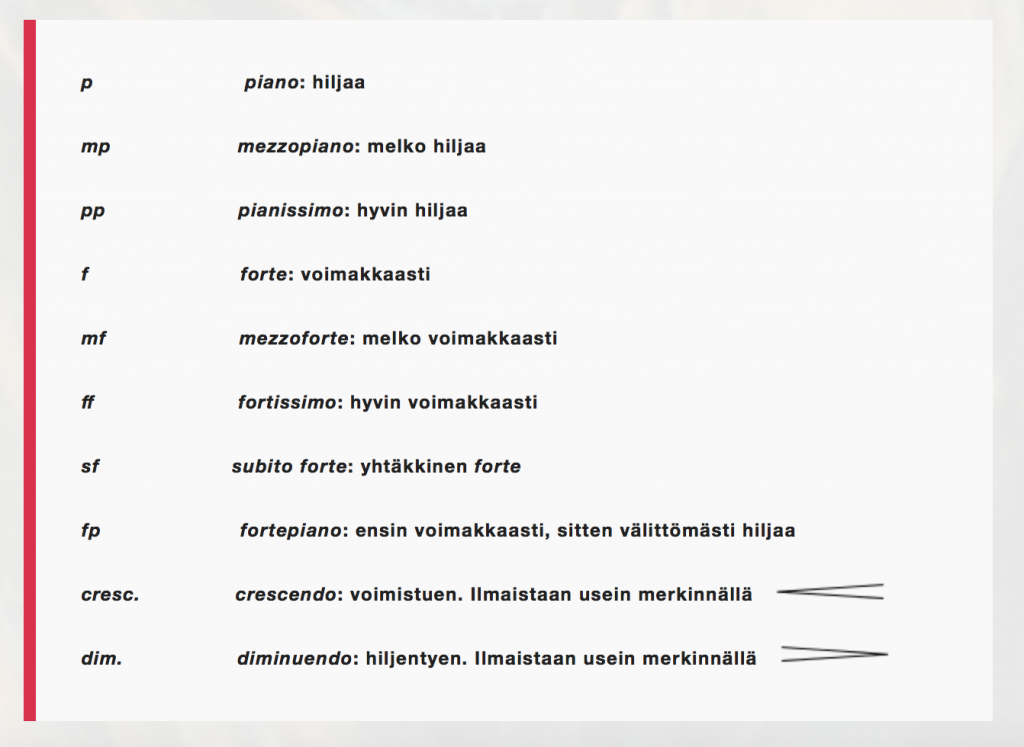 Dynaamisia merkintöjä (Lähde: https://hilkkapiipponen.com/dynamiikkamerkinnat/)